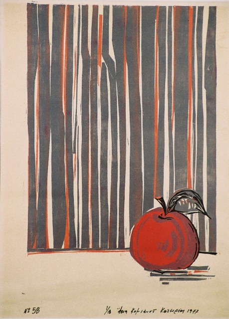 Κομιανού Άρια (1938-2015), Μήλο, 1977, έγχρωμη ξυλογραφία σε πλάγιο ξύλ,. 48,7 x 33,2 εκ. Νο 58, Πινακοθήκη Χαρακτικής Δήμου Ζίτσας.