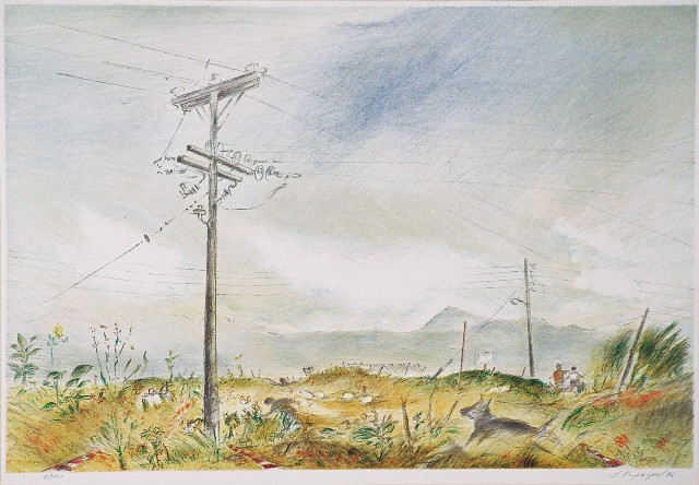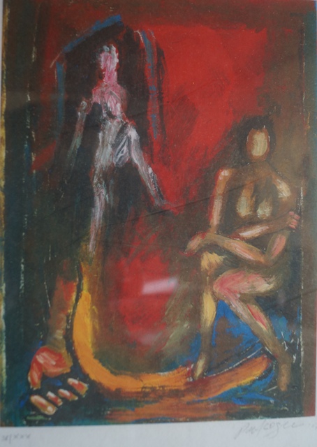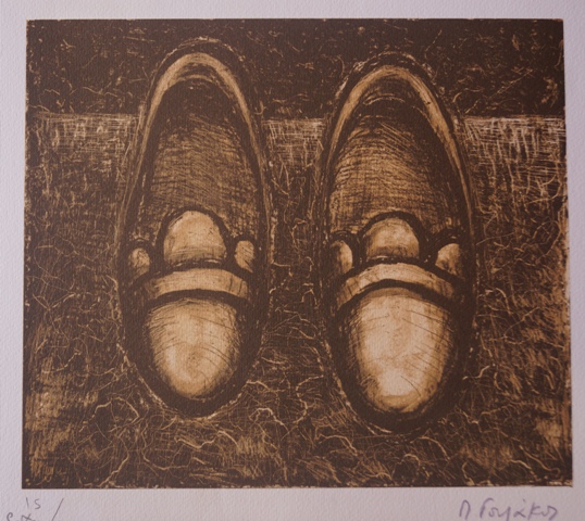 Βακιρτζής Γιώργος (1923-1988), Οι νέοι με τα πρησμένα πόδια που τους έλεγαν αλήτες, 1979, μεταξοτυπία, 57 x 39 εκ., 125/240, Πινακοθήκη Χαρακτικής Δήμου Ζίτσας.
