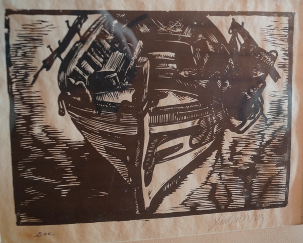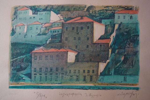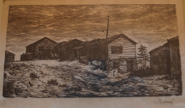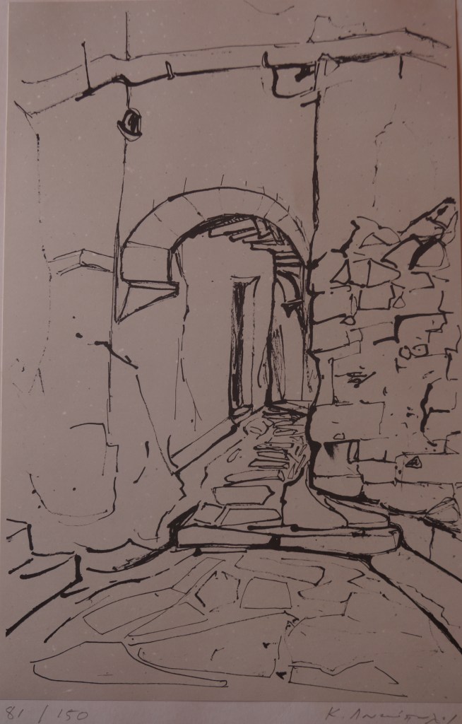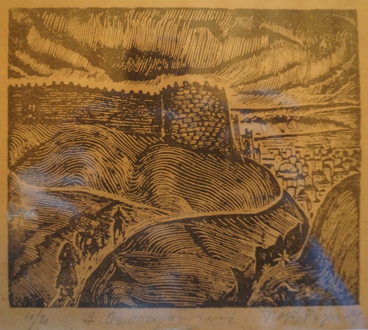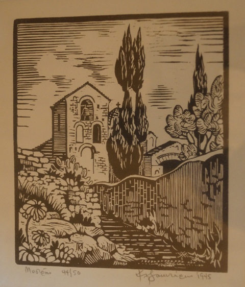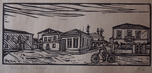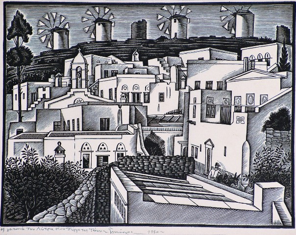 Μόσχος Γιώργος (1906-1990), Η γειτονιά του Λύτρα στον Πύργο της Τήνου, 1950, ξυλογραφία σε όρθιο ξύλο, 28,5 x 37 εκ., Πινακοθήκη Χαρακτικής Δήμου Ζίτσας.