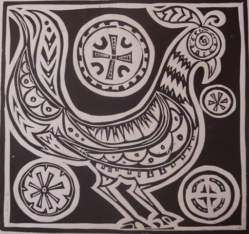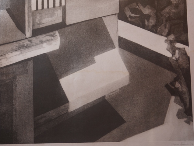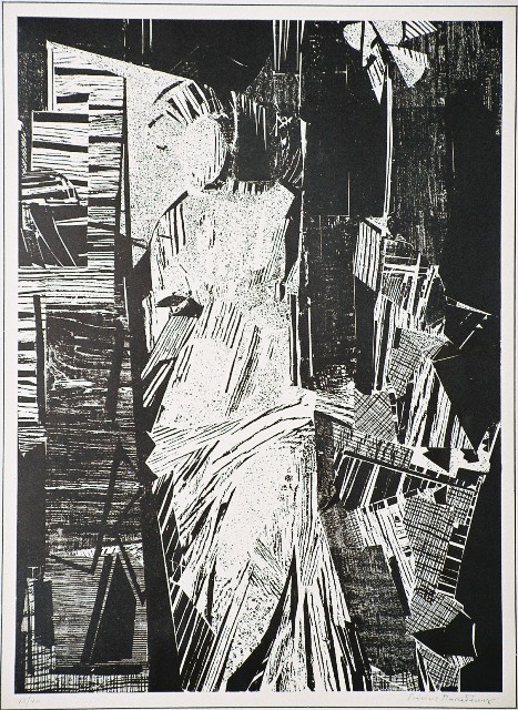 Παπαδάκης Γιάννης (1934), Σύνθεση, 1991, ξυλογραφία σε πλάγιο ξύλο, 62,8 x 45,5 εκ,. 15/40, Πινακοθήκη Χαρακτικής Δήμου Ζίτσας.
