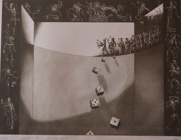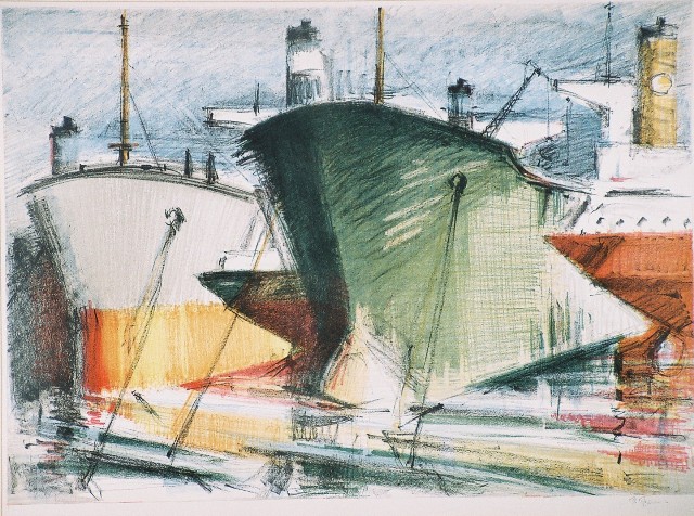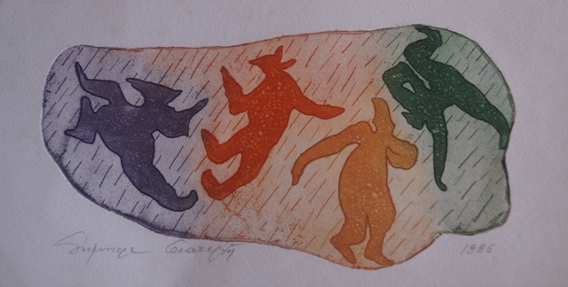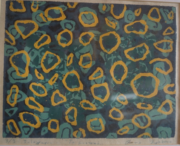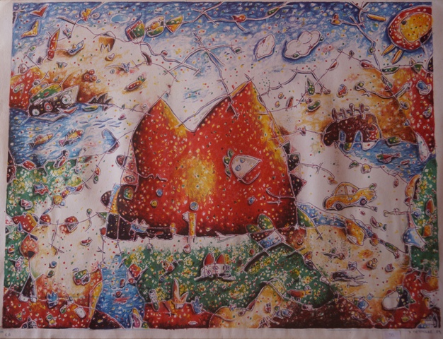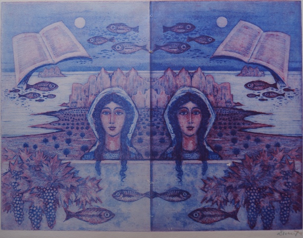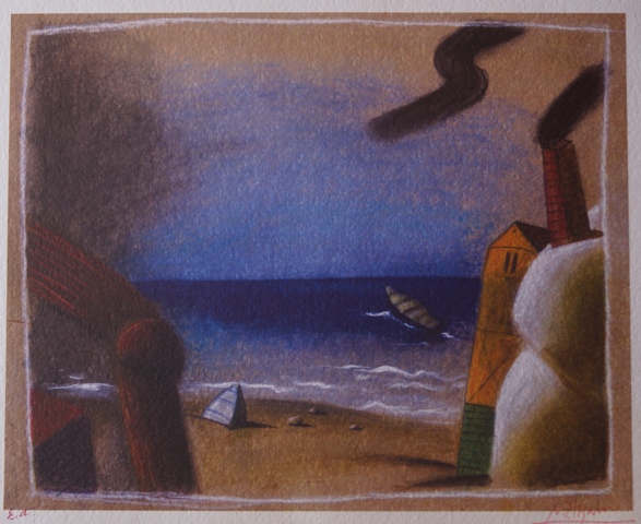Καπελιάρη Ράνια (1960), Το καραβάκι του Αλέξανδρου, 1990, δοκίμιο έγχρωμης λιθογραφίας. 19,3 x 14,2 εκ., 18,4 x 12,4 εκ., 19,3 x 13,6 εκ. , Πινακοθήκη Χαρακτικής Δήμου Ζίτσας.