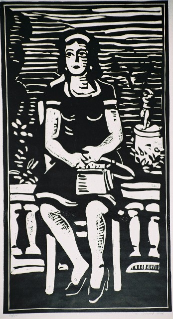 Κάνθος Τηλέμαχος (1910-1993), Θρήνος γυναικών, από τη σειρά Σκληροί χρόνοι, 1976, ξυλογραφία σε πλάγιο ξύλο, 34 x 29,7 εκ. 25/90, ΠΙνακοθήκη Χαρακτικής Δήμου Ζίτσας.