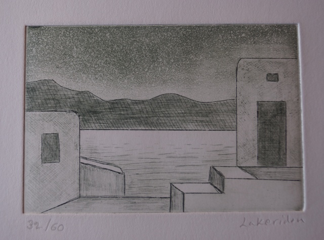 Κογεβίνας Λυκούργος (1887-1940), Ο θησαυρός των Αθηναίων στους Δελφούς, (από το λεύκωμα Grèce. Paysages Antiques), πριν από το 1924, γραμμική οξυγραφία, 13,5 x 18,2 εκ. 68/200, Πινακοθήκη Χαρακτικής Δήμου Ζίτσας.